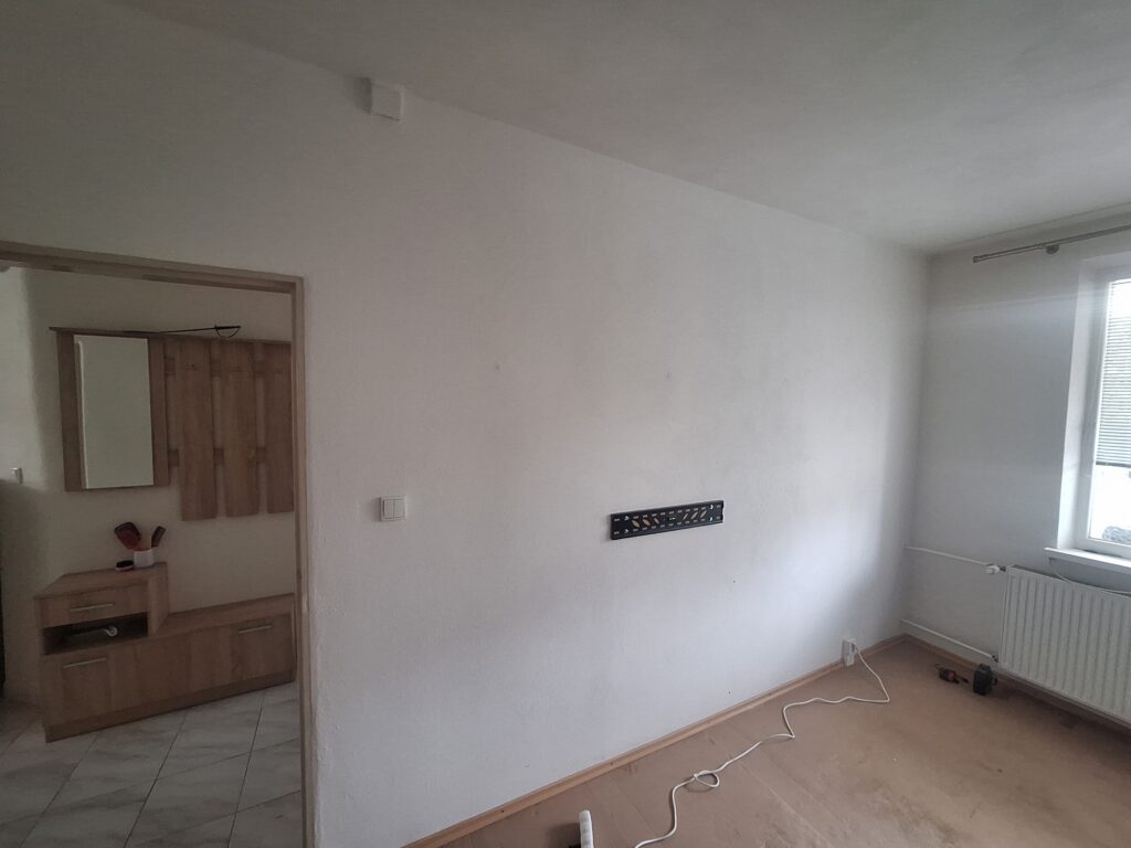 Na prvej fotke vidíte východiskový stav: obyčajná maľovka, trčiace káble na podlahe a namontovaný držiak na TV. Nič zložité, ale vizuálne prázdne.